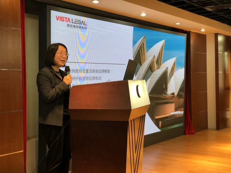 图为李东昱律师演讲 邓莉娟律师,中国及澳大利亚最高法院、新南威尔士州高等法院律师。邓莉娟律师的演讲主题为“澳大利亚商业法律概述”,介绍了在澳投资的六种形式,设立的流程以及需要注意的法律事项。