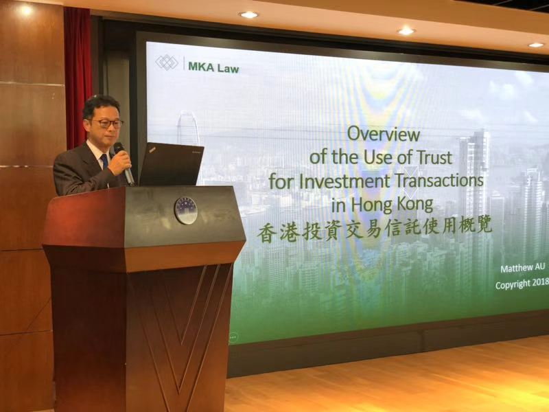 图为刘伟洪律师演讲 区景昌律师,香港资深证券投资和银行业务律师。区景昌律师演讲主题为“香港投资交易信托使用概览”,详细介绍了香港信托的设立及使用。