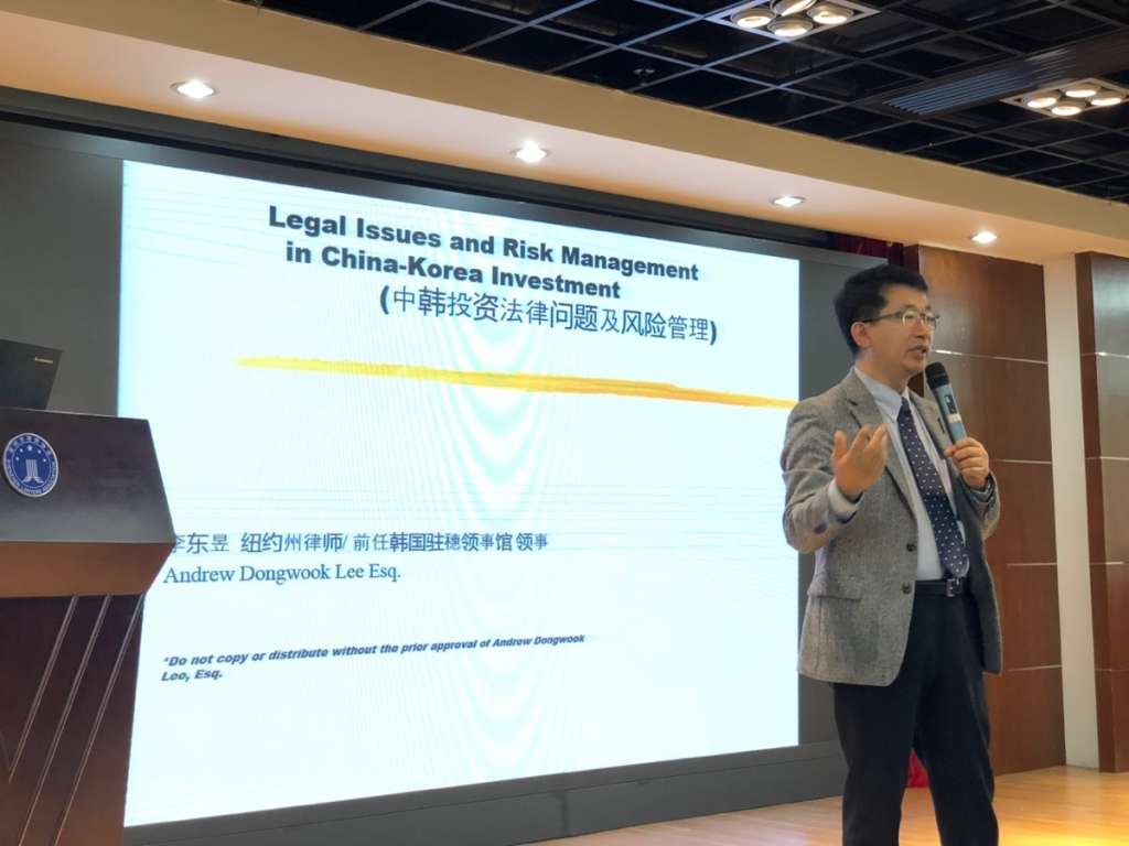 李东昱律师,大韩民国驻广州总领事馆前任领事,对中、韩及亚洲多国法律、外交及政策有深刻见解,其演讲的主题为“中韩投资法律问题及风险管理”,深入浅出,从中韩国际政治、经济形势出发,讲述了影响韩国企业在中国投资的几点要素以及韩国企业在中国投资过程中的法律风险。